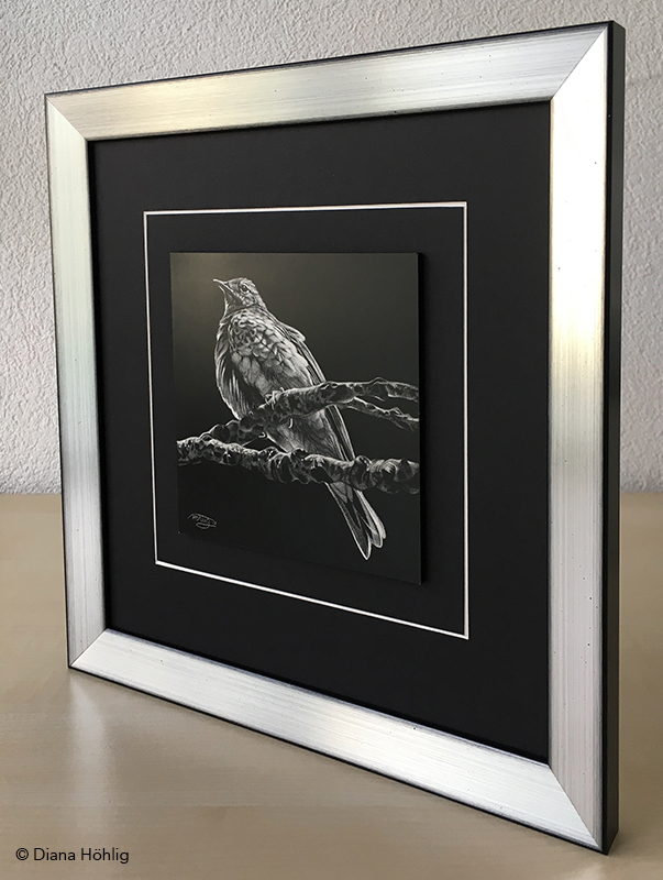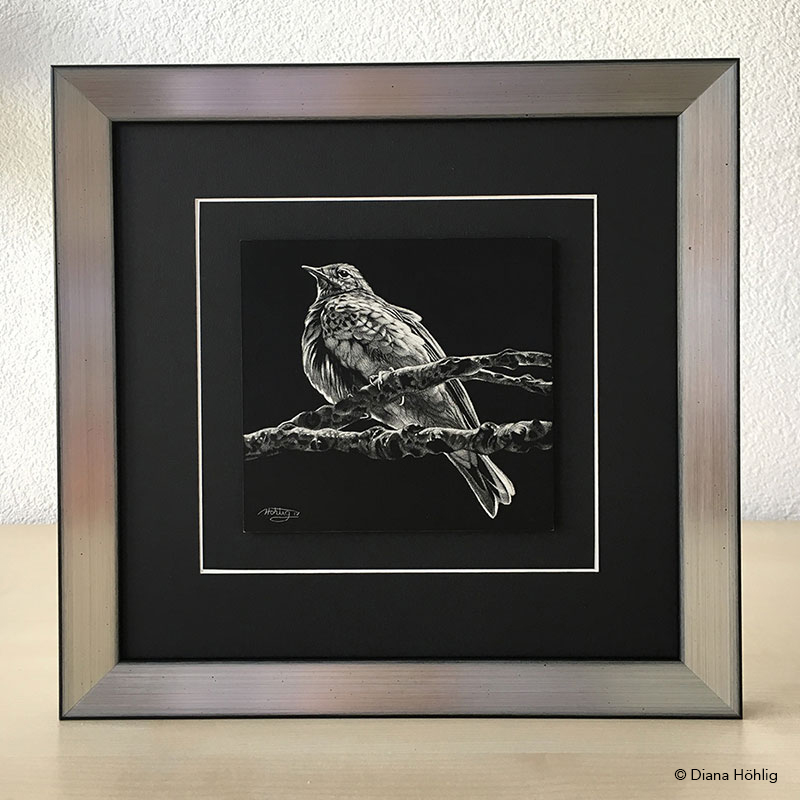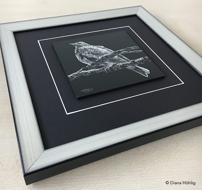 Die originale Scratchboard Arbeit zeigt einen Baumpieper, welcher in der Krone einer alten Esche verweilt. Das Bild ist harmonisch gerahmt mit einem schwarzen Passepartout und einer edlen Holzleiste in der Kombination Schwarz-Silber. Ein charmantes Kunstwerk für das Zuhause eines jeden Vogelliebhabers.