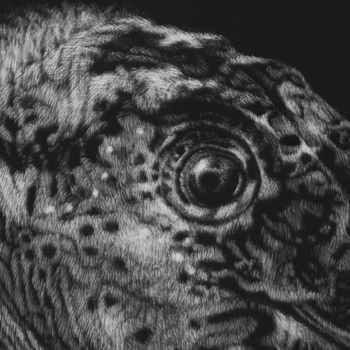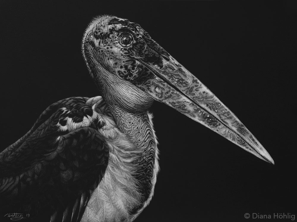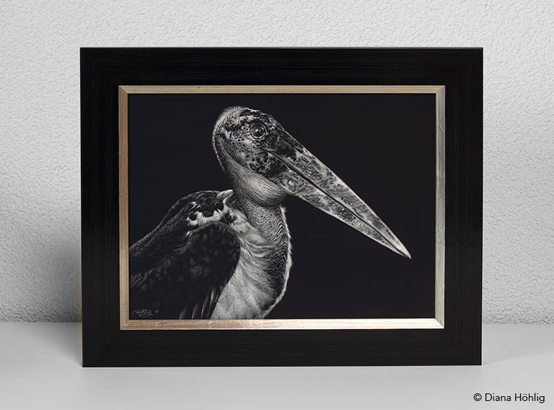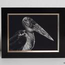 Diese exquisite Scratchboard-Arbeit zeigt einen Storch aus der Alten-Welt im fernen Afrika. Der Marabu Storch hat ein sehr prähistorisches Aussehen, doch sein Charisma hat eigene Klasse. Die Arbeit ist mit einer hochwertigen Holzleiste gerahmt, welche eine edle Goldapplikation auf der Innenseite des dunklen Rahmens zeigt und das Kunstwerk perfekt in Szene setzt.