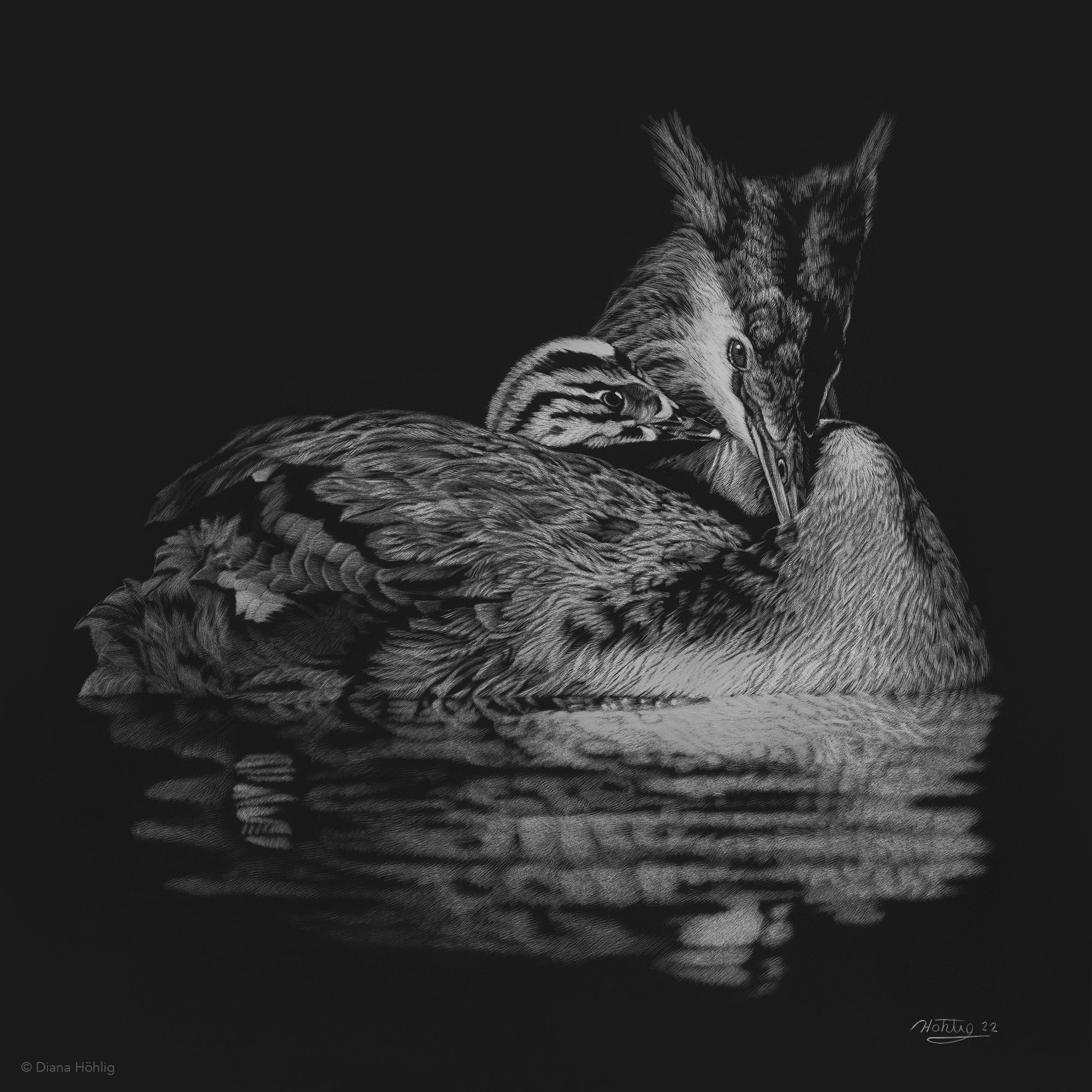 Diana has been selected with her work in the international acclaimed Birds in Art exhibition in 2016, 2017, 2021 and is chosen by the jury for the fourth time with her artwork 'Tender Reflections' - Great Crested Grebe with chick in Scratchboard technique.