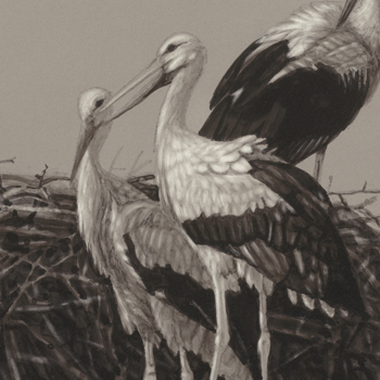 This artwork shows the impressive nest structures of the White storks on a rooftop. The painting is done in mixed-media technique. I use a clayboard as basis and paint with diluted black ink on the surface. Afterwards, I use traditional scratchboard technique to create the fine details with a scalpel knife, to portray the birds in monochrome style.