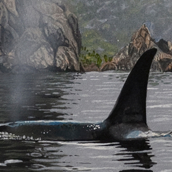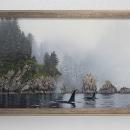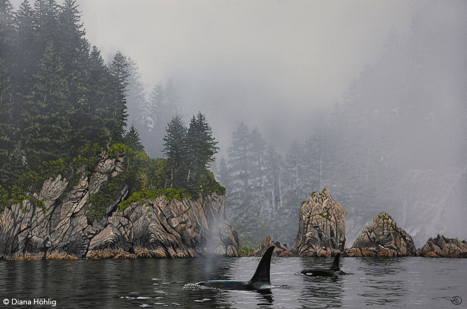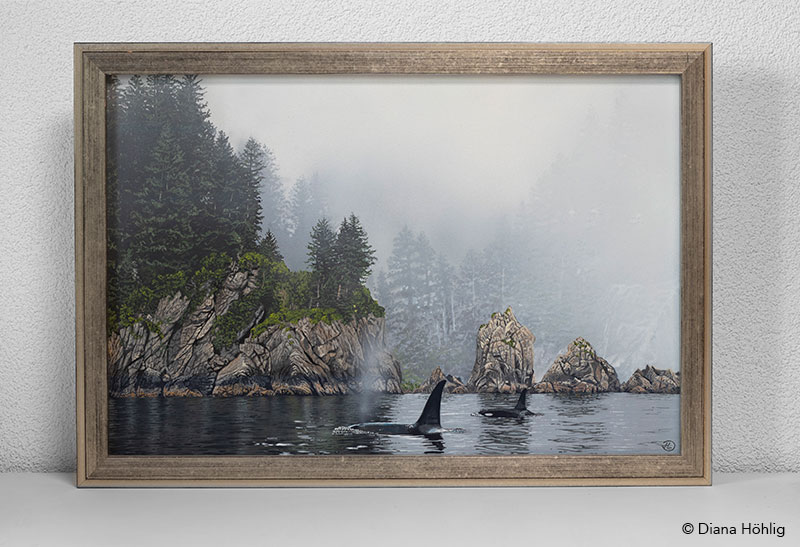 The beautiful original acrylic painting is done on a hand prepared gessoboard. The painting has a wooden frame in rustic optic, which is echoing the rough coastline habitat shown in this unique artwork.